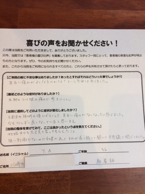 2回目の施術の後、しばらくして本当に痛みが無くなったと感じました。